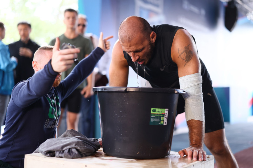 Последний комплекс собрал разные испытания: приседания «пистолетиком», баланс на доске, отжимания и стойку на руках вертикально, работали атлеты с мячом в 60 кило, а самым необычным стало испытание с задержкой дыхания. Атлеты опускали в бочку с водой голову и должны были продержаться в общей сложности 60 секунд. Затем работа на перекладине и в обратную сторону по этим же упражнениям. «Крышка» на все — 12 минут.