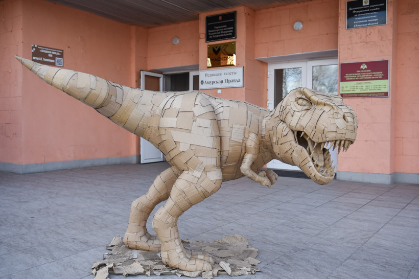 В Благовещенске в холле комплекса «Приамурье» на Калинина, 126 поселился картонный динозавр. Его автор скульптор Александр Кантемиров, создавший вместе с коллегами скандальный 10-килограммовый пельмень, деревянных динозавра Викторию, русского полковника Михаила Манакина и черного пса.