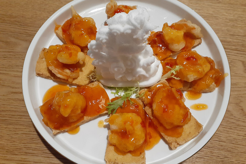 Шви-тофу с креветками в апельсиновом соусе (400 руб.) — блюдо не только оригинальное с виду, но и очень вкусное. Крупные и, что немаловажно, не перемороженные креветки в тонкой панировке уложены на небольшие пластины тофу, и всё это полито остро-сладким соусом. Пальчики оближешь в прямом смысле, так как палочками без особой сноровки такие необычные бутерброды практически не взять.