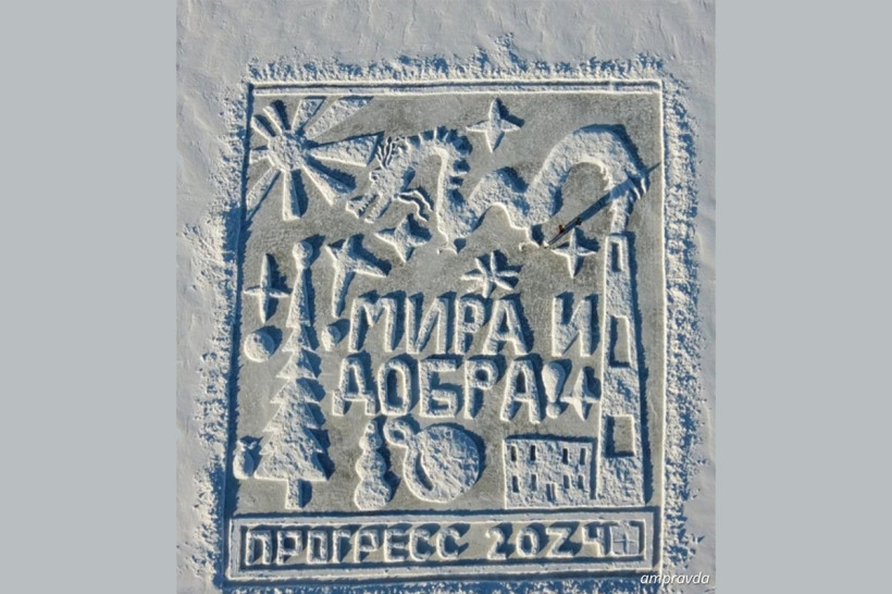 Работали дружные художники четыре часа, согреваясь теплым чаем. Хотя на самом деле, говорят участники, они совсем не замерзли с лопатами и метлами. Размер открытки впечатляет — 30 на 40 метров. Ее хорошо видно с трассы. Рядом еще проходит железная дорога, и тепловозы сигналили художникам, работавшим на льду.