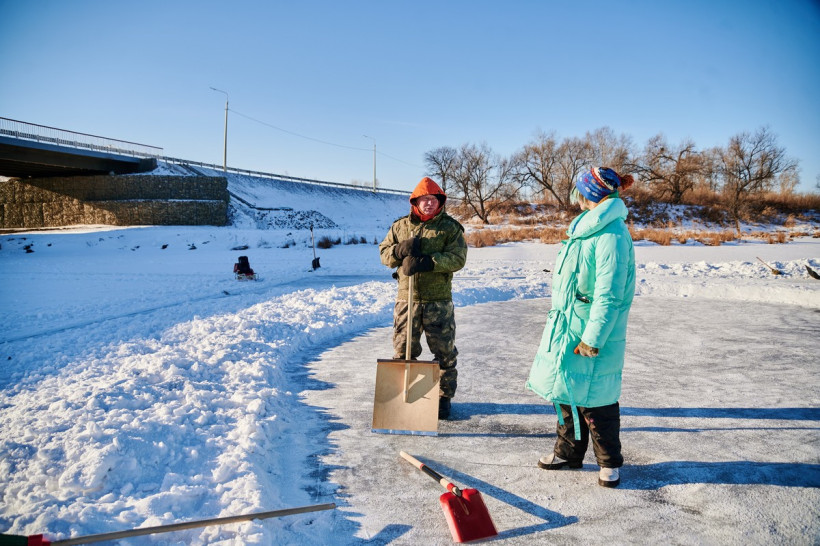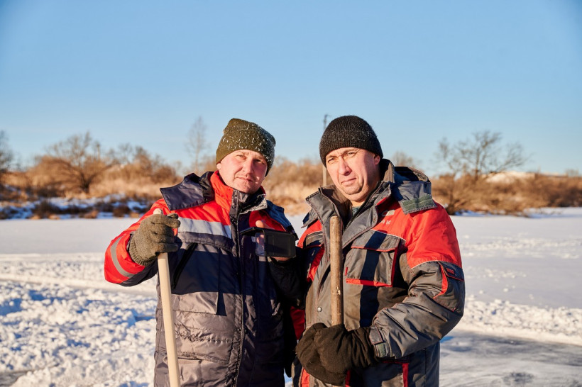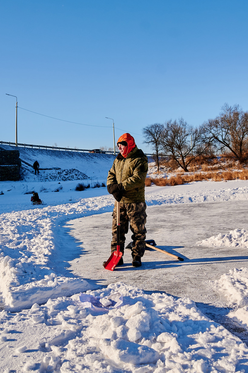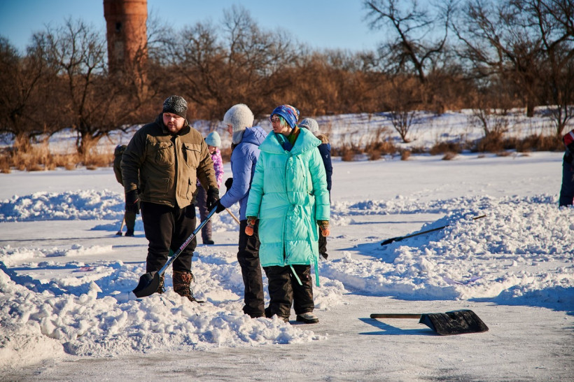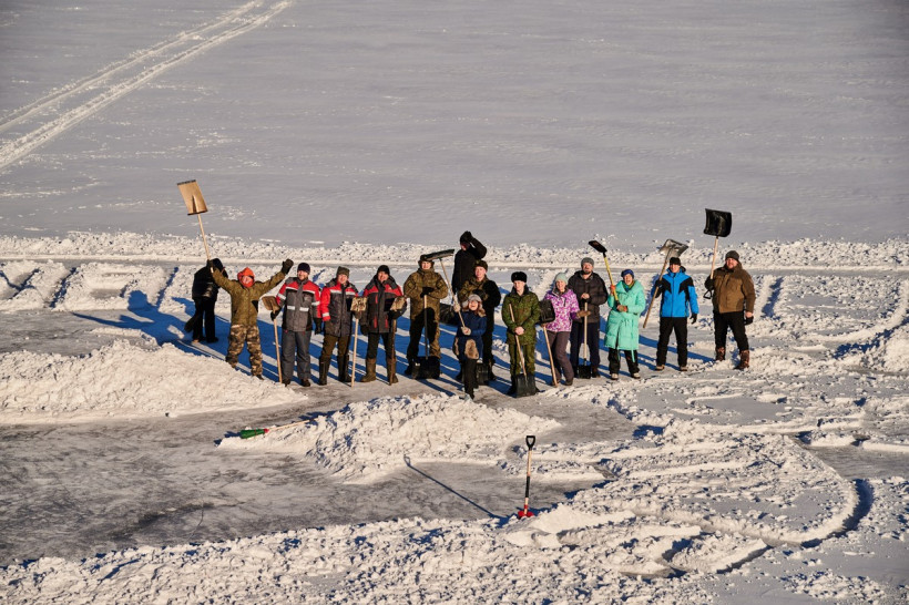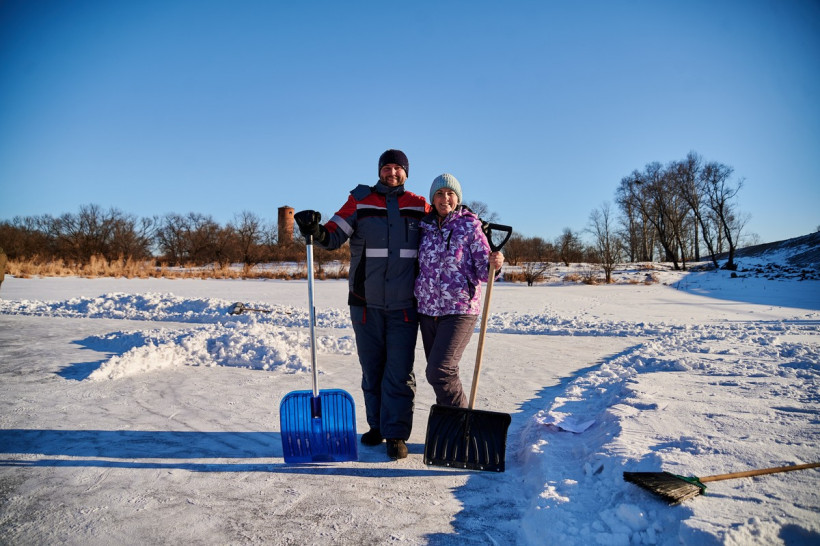 Короткий инструктаж — и за лопаты! Через полчаса команда стала расширяться: на лед приехали дружеские пары — Антон и Анна Алексеева и Сергей и Наталья Лежак. Оставили дома детей, чтобы впервые почувствовать в доброй акции и себя художниками по льду и снегу.