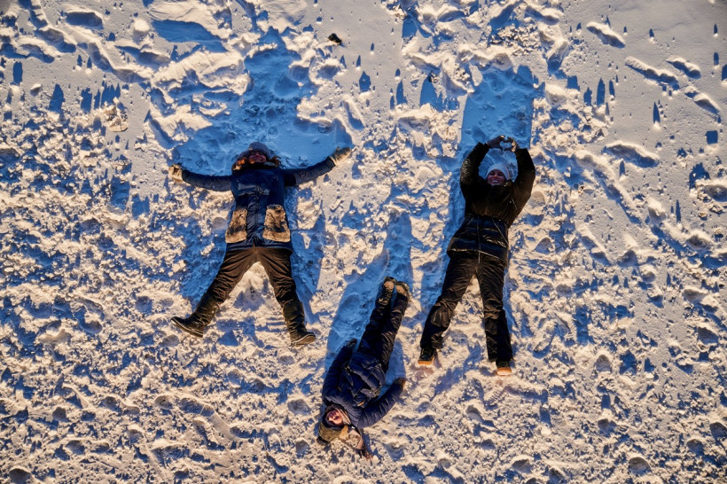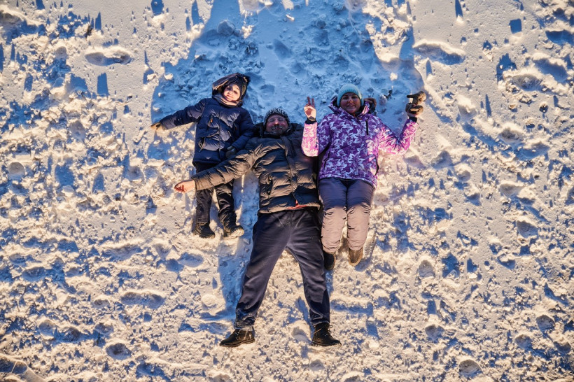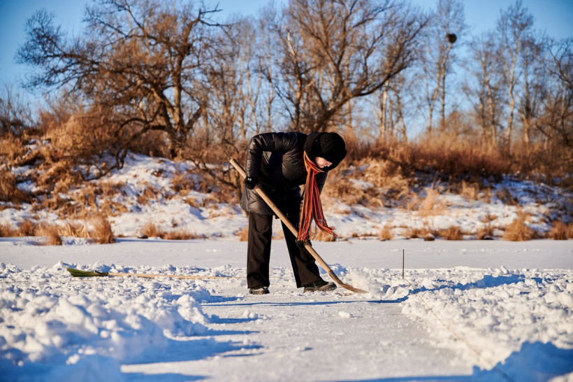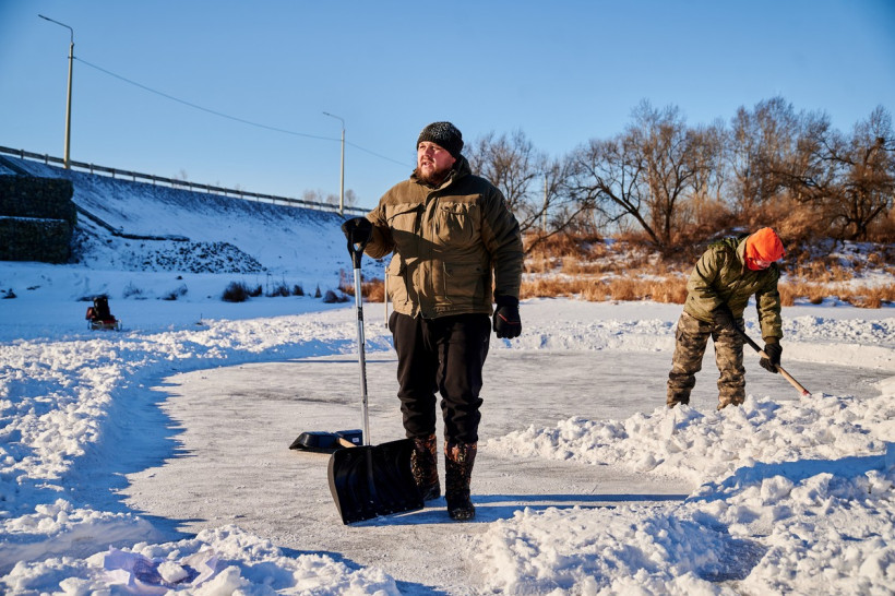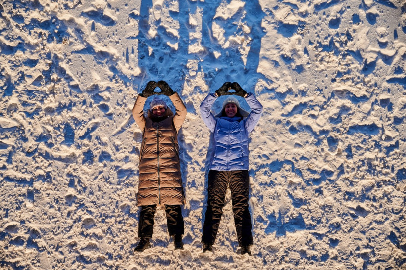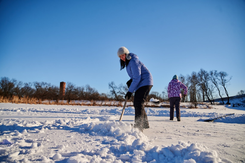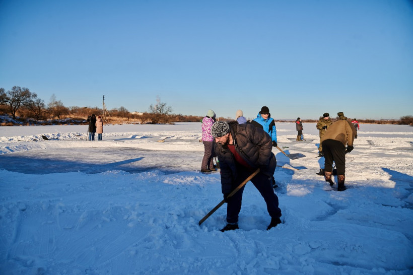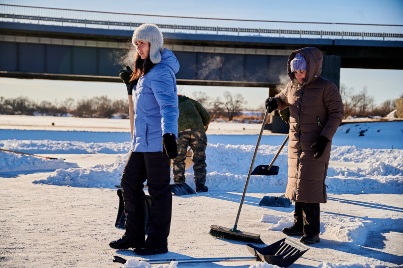 Короткий инструктаж — и за лопаты! Через полчаса команда стала расширяться: на лед приехали дружеские пары — Антон и Анна Алексеева и Сергей и Наталья Лежак. Оставили дома детей, чтобы впервые почувствовать в доброй акции и себя художниками по льду и снегу.