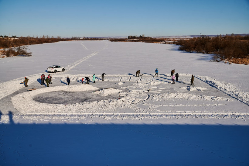 Команда лишь однажды сделала перерыв — горячий чай привезли пограничники с заставы села Марково, а вкуснейшие пирожки, испеченные специально для художников кулинарами «Приличной столовой», придали сил творцам на льду.