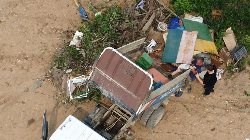 На фотографиях, сделанных специалистами, видно, как из грузовика выходят два крепких мужчины, открывают борт кузова и прямо на землю выгружают содержимое, напоминающее доски, арматуру и прочий строительный мусор. Затем они садятся в машину и уезжают.