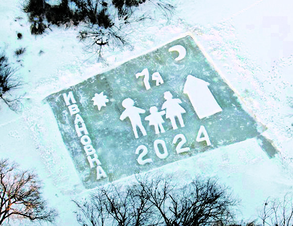 «Тянет к реке»: семейная пара из амурской Ивановки нарисовала ледовую открытку в честь Года семьи