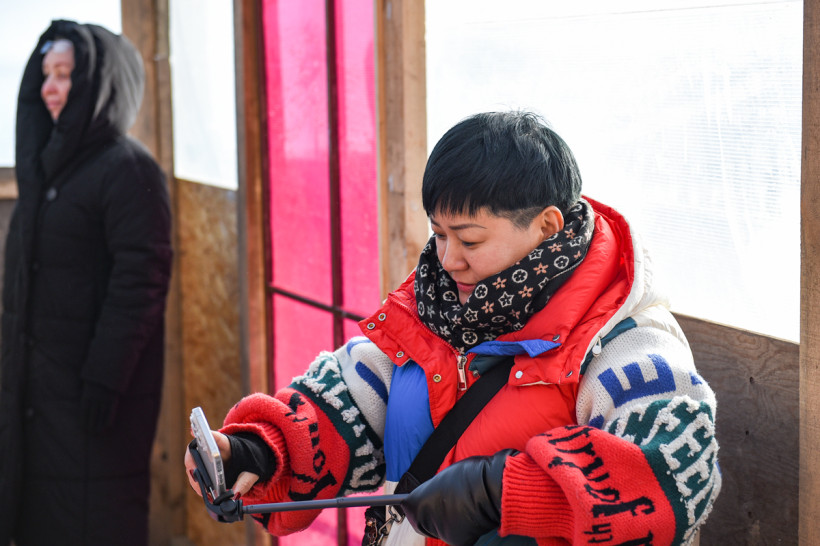 Ее коллега по здоровому образу жизни на купель смотрит из теплой раздевалки через щелку. Девушка от страха несколько раз переспрашивает опытную Наталью, стоит ли окунаться с головой. Горожанка долго настраивается и все-таки решается. Окунувшись три раза в ледяную воду, бежит в раздевалку, воскликнув: