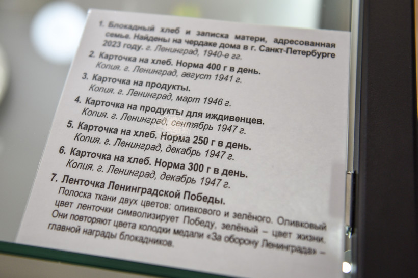 В центре зала — витрина с кусочком блокадного хлеба. Он почернел от времени, но гораздо страшнее — историческая справка рядом. Норма хлеба для ребенка к концу 1941 года была всего 125 граммов в сутки. Такая же — для служащих и иждивенцев. Солдатам, которые сражались на передовой — по 500 граммов в день, рабочим горячих цехов — по 375 г, остальным труженикам — по 250 г.