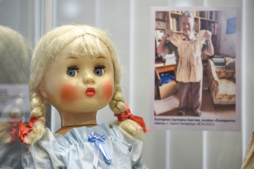 Рядом — старенькая матерчатая обезьянка. Это немецкая игрушка, которую выпускали еще до Великой Отечественной войны. Такая же хранится в Музее блокады Ленинграда в Санкт-Петербурге. Побывала ли именно эта обезьянка в осажденном городе, неизвестно, но точно такие же были у детей тех лет во время блокады.