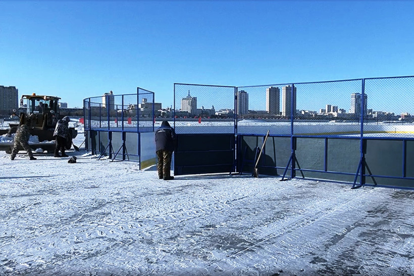 В Благовещенске на льду Амура установили хоккейную коробку и монтируют трибуны для зрителей