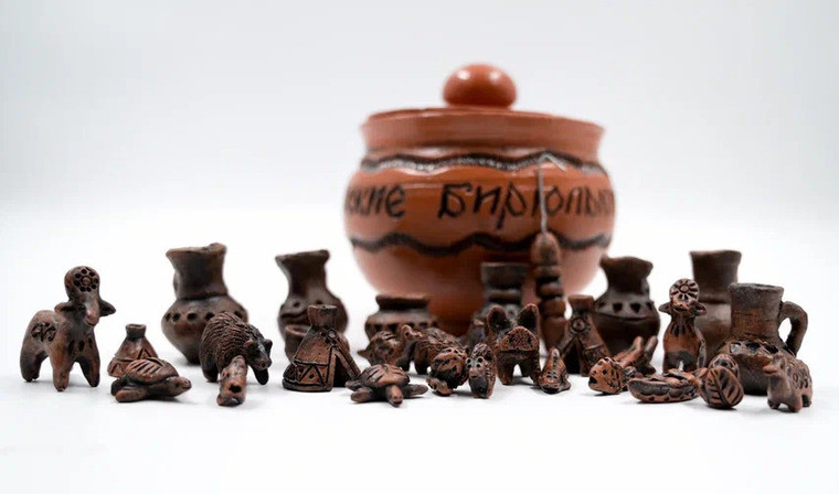 Также в уникальный игровой комплект входят керамический горшок с крышкой, украшенный надписью с названием семейной игры, и миниатюрная глиняная посуда — кувшинчики, крынки, чашки, выполненные на гончарном круге Сергеем Клещёвым, руководителем студии «Живая глина» Амурского областного дома народного творчества.