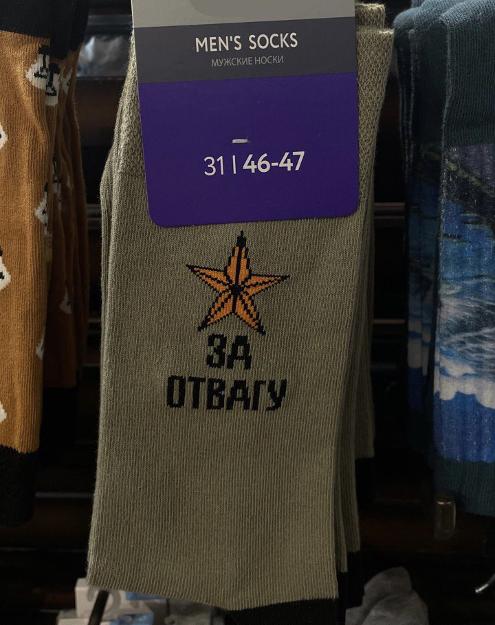 Носки цвета хаки для самых отважных и смелых с изображением звезды и надписью «За отвагу» предлагают купить за 200 рублей. Чуть дешевле стоит подарок для любимых мужских ног со смешными надписями, например, «100% мужик».