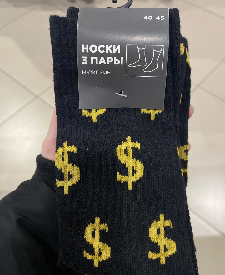Определиться, с каким настроением начать новый день, помогут носки с надписью «С той ноги», цена пары — 380 рублей. Несмотря на солидный курс доллара, за носки с изображением символа этой валюты придется отдать 400 рублей, причем за три пары. За 300 рублей можно приобрести пару белых носков с изображениями автомобилей.