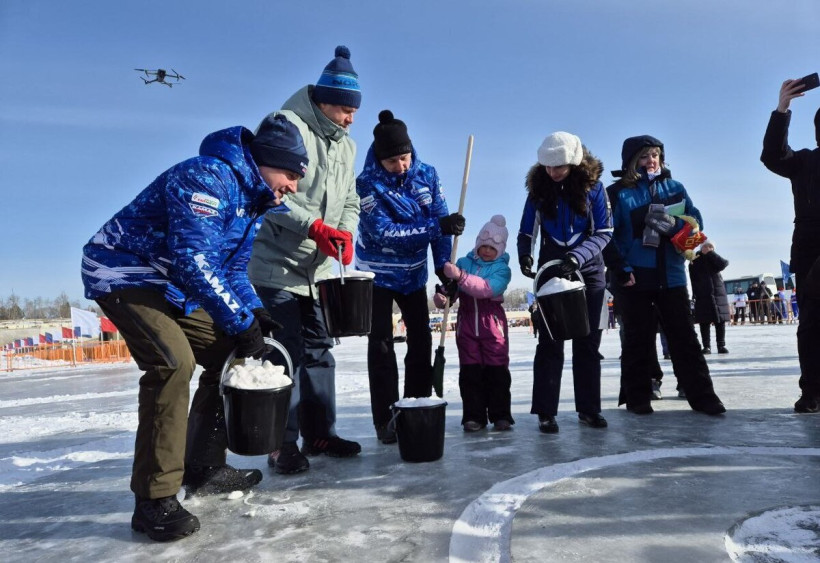 — Со стороны Амурской области рисовала команда ледовых художников «Амурской правды», приехали люди из Белогорска, Свободного, Сковородина, Магдагачей, Михайловки. Это люди, которые рисуют открытки несколько лет, люди разных профессий, — прокомментировала главный редактор АП Елена Павлова. — Помогала нам активно министр культуры Надежда Доргунова, потом пришли почетные гости — Василий Орлов с женой Анной и дочкой, министр Дальнего Востока и Арктики Алексей Чекунков, под конец пришел известный спортивный комментатор Дмитрий Губерниев. Их почетная миссия — засыпать снегом шайбу.