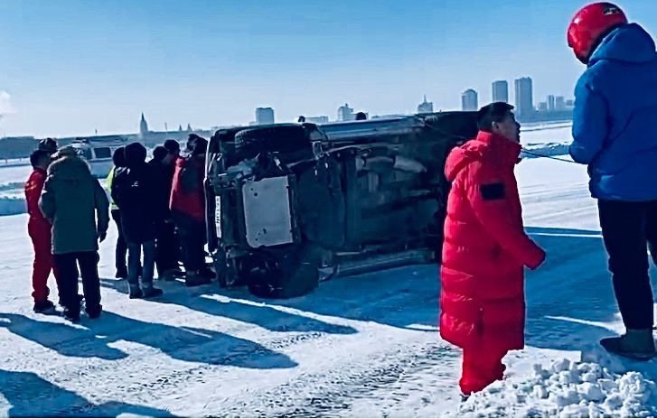 Ледово-транспортное происшествие произошло во время автогонок на Амуре: китайский спортсмен совершил ошибку, и его джип перевернулся. Обошлось без пострадавших.