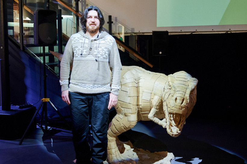 Картонного тираннозавра Александр Кантемиров выставил на «18-35.22» — уникальной выставке современного искусства областного молодежного отделения Союза художников.