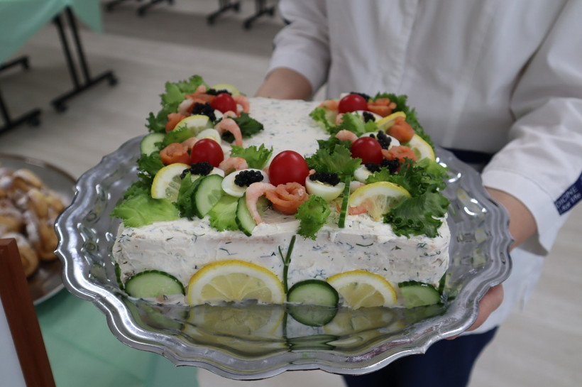 Второе место с закусочным тортом заняли специалисты лор-отделения, третьими стали работники отделения патологии новорождённых и недошенных детей ОПЦ. Они приготовили торт, украшенный аистом с младенцем.