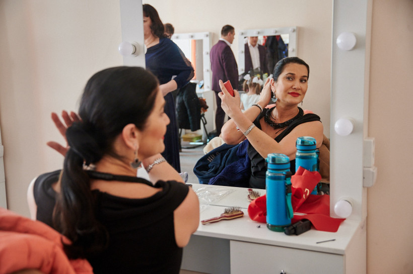 Гримерные дома культуры железнодорожников в Свободном превратились в семейные комнаты. Здесь участницы, подкручивая локоны и крася ресницы, тренировали с детьми их роли и раздавали финальные наставления мужьям.