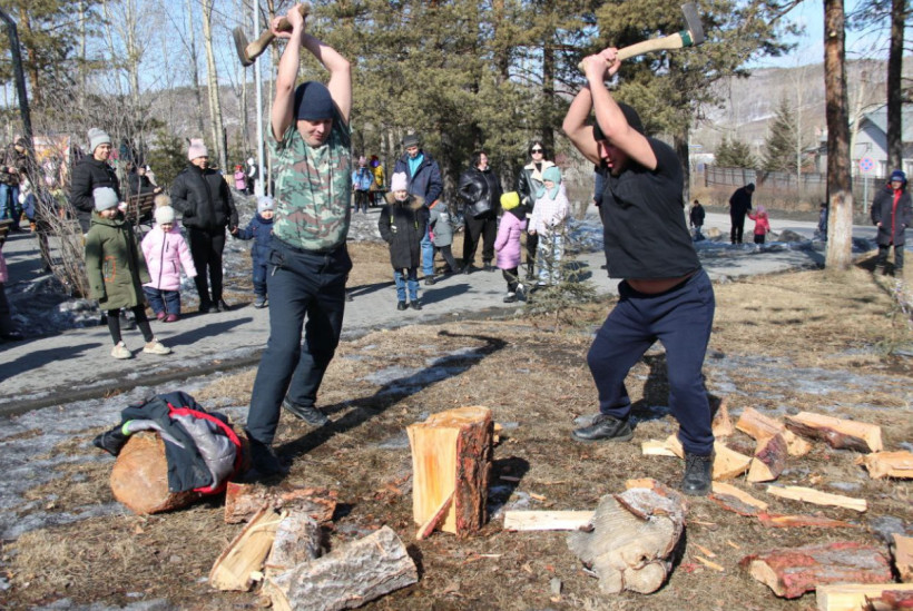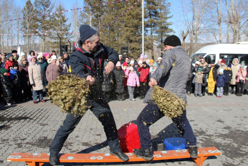 Также весело и сытно провожали зиму и жители города Сковородино. Только сильная половина горожан, в отличие от тындинских мужчин, продемонстрировала свою силу: мужчины с азартом кололи дрова и пытались столкнуть соперника со скамейки с помощью банного веника.