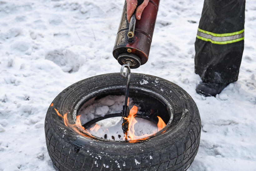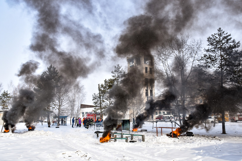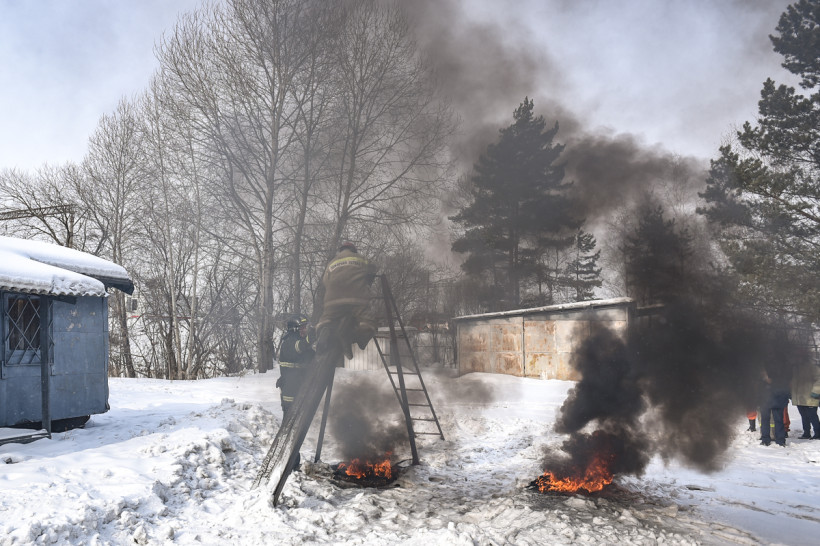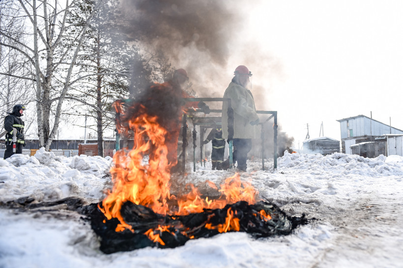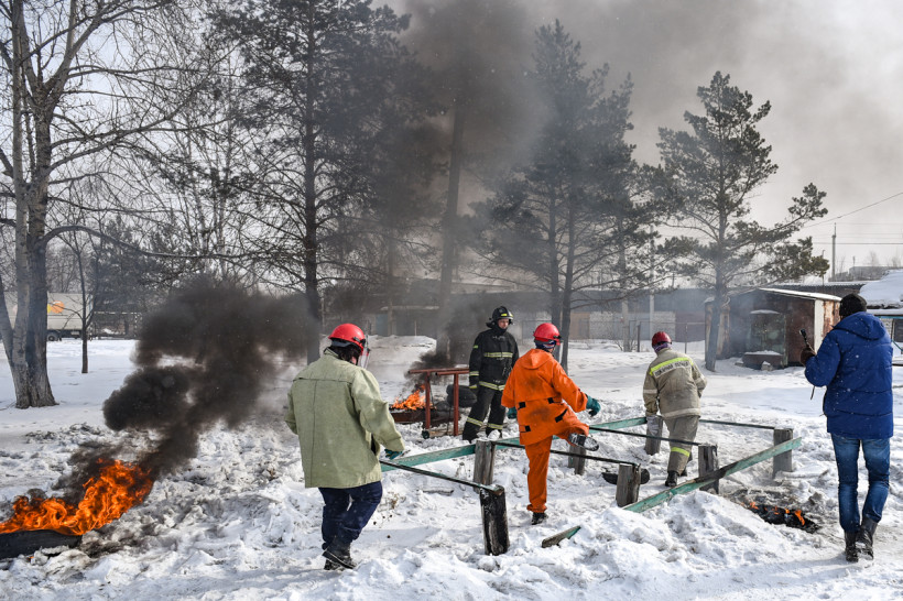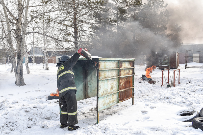 Возле пожарной части в Новобурейском уже всё готово. Баллоны подожжены специальными горелками. Здесь главное — не испугаться пройти через стену едкого дыма. Задача тренировок — воспитать в добровольцах умение преодолевать страх перед опасностью и контролировать свои действия при возможных происшествиях.