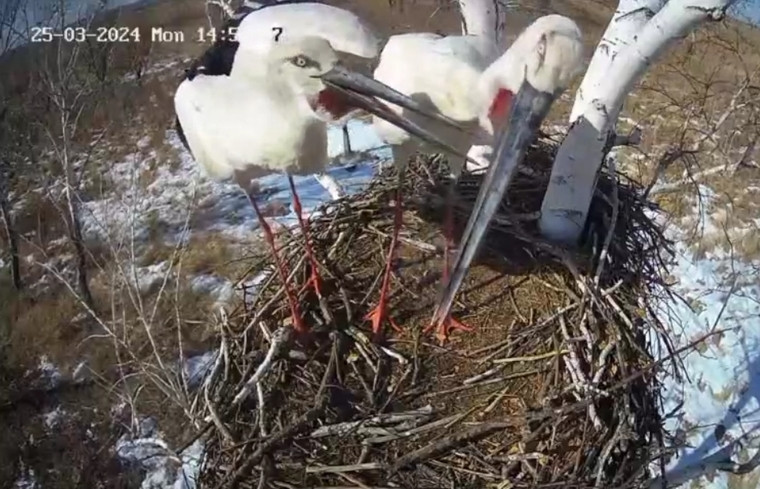 В гнездо в Березовском заказнике вернулся второй аист. Как сообщала «Амурская правда», первая птица прилетела в отчий дом, оборудованный видеокамерой, 24 марта. «Получается, второй аист, самка, вернулась в гнездо спустя почти сутки. А то мы уже переживать начали за него», — написал в своем телеграм-канале научный сотрудник Муравьевского парка Антон Сасин.