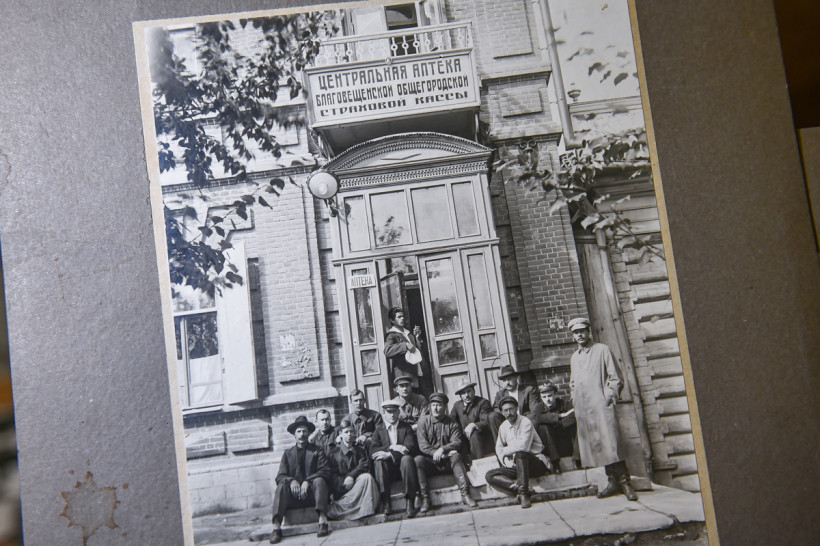 На фото в центре — Герасим Шпилев. «Эта аптека — первая в Благовещенске. Коллектив АП и ревизионная комиссия посещали центральную аптеку Госстраха», — пояснила Лариса Завгородняя. Фото: Алексей Сухушин