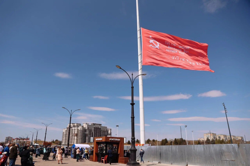 Копию Знамени Победы подняли на самый высокий флагшток Дальнего Востока в Благовещенске