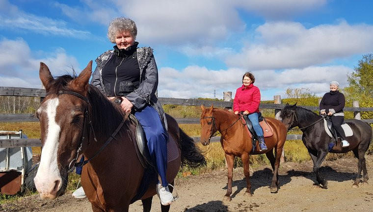 — Стандартная прогулка у нас длится час, но несколько раз в год мы устраиваем длительные, по три часа, переходы с привалами, чаепитием, — говорит администратор клуба Елена Руденко. — Дети тоже могут участвовать в конных походах: подготовленные, с опытом верховой езды, с 12 лет, без опыта — с 14 лет. Поскольку у нас в округе практически нет леса, то маршруты проходят по полям, по нашим покосам, вдоль небольшой речки Симоновки. Опытные всадники могут за час пройти от 5 до 12 километров.