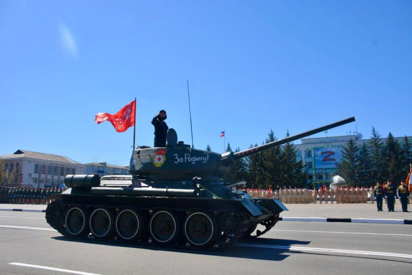 Механизированную колонну военной техники традиционно возглавил легендарный танк Т-34. Эта «Боевая подруга» принимала участие в боях Великой Отечественной войны в составе второго гвардейского Тацинского танкового корпуса. Возглавил экипаж танка заместитель начальника ДВОКУ по вооружению полковник Доржо Нарполов — отец Героя Российской Федерации, выпускника училища, героически погибшего в ходе специальной военной операции.
