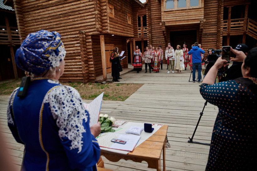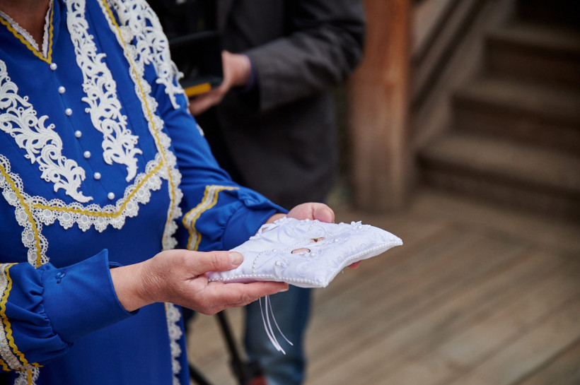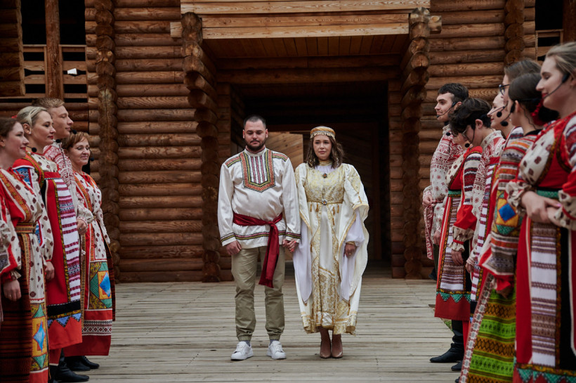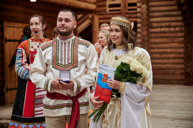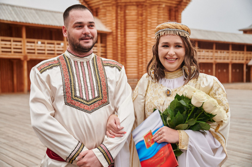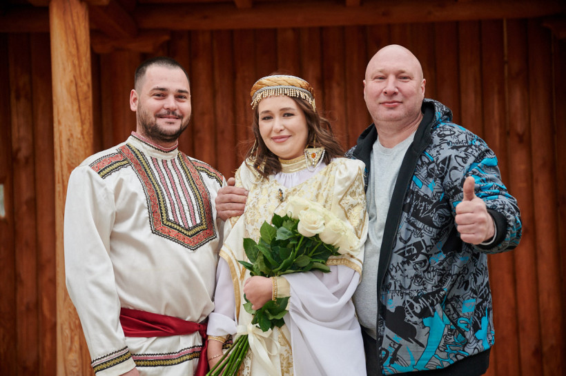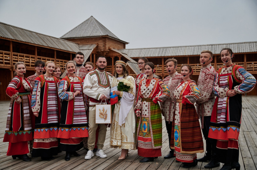 Сотрудники загса обеспечили молодоженов нарядами. Невесте дали русское народное платье и украшения, а жениху — рубашку.