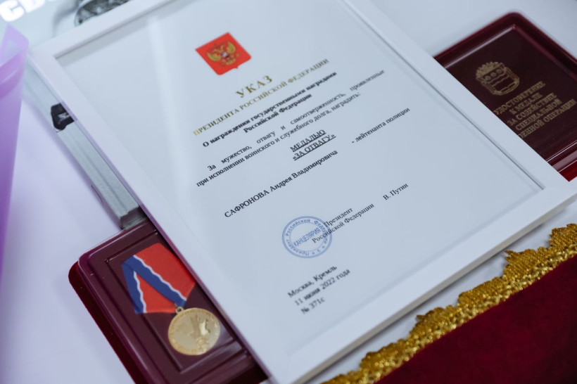 Губернатор Амурской области Василий Орлов в понедельник, 13 мая, вручил лейтенанту полиции Андрею Сафронову медаль «За отвагу». К государственной награде участник специальной военной операции представлен по Указу Президента РФ за проявленные в зоне боевых действий мужество и самоотверженность. На СВО он вместе с группой сотрудников попал под обстрел противника и получил тяжелую рану. Но несмотря на это продолжил руководить личным составом.