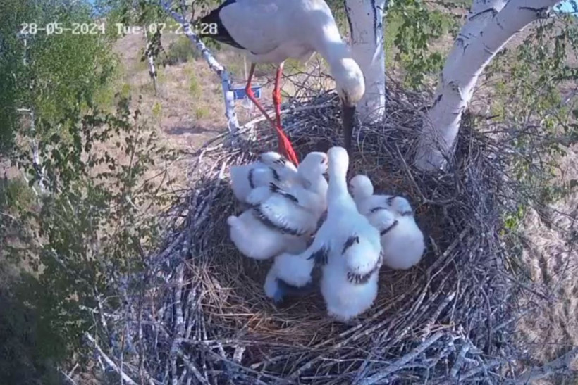 В середине мая у пары аистов из Березовского заказника вылупились все четыре птенца. Последний пернатый малыш появился за те четыре дня, когда камера, установленная для наблюдения за пернатыми, была сломана.