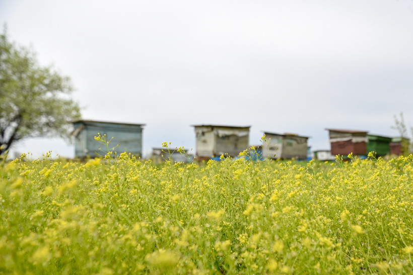Действительно, пасека Сергея Федюкова — полностью автономное производство. В несколько рядов посреди поля стоят ульи, рядом два прицепа. В одном — инструменты, это рабочий прицеп. Второй — небольшой походный дом со своей кухней и зоной отдыха.