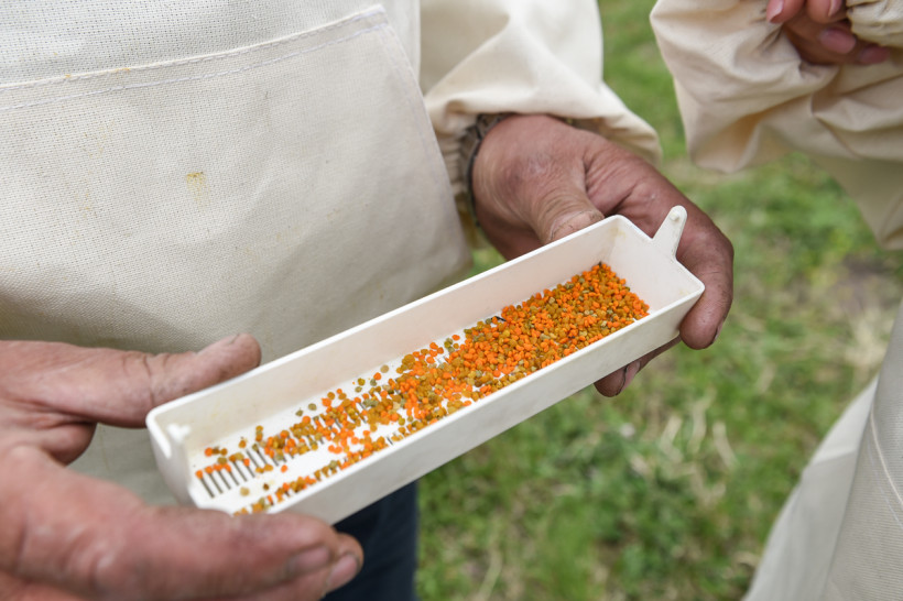 — Когда рабочая пчела выходит из ячейки, она начинает работать нянькой для личинок — кормит их, — говорит Сергей Федюков. — Став постарше, становится приемщицей: рабочая пчела приносит с полей нектар и пыльцу, а приемщицы укладывают добычу в ячейки. Затем пчела переходит в разряд рабочих и сама летает по полям, добывая нектар и пыльцу. Пыльца нужна для корма личинок.