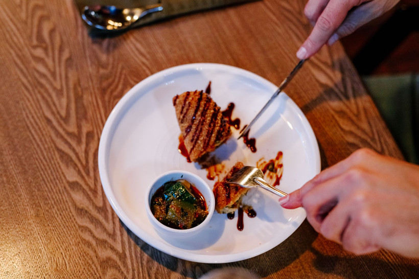 — Мы испекли классические русские блины, мясной фарш и папоротник закрутили в блин, сделали из него рулет, потом обмакнули в льезон, запанировали в сухарях и обжарили во фритюре, — раскрывает рецепт приготовления бренд-шеф ресторана. — Блюдо подается с битыми огурцами, поэтому происходит объединение русской кухни и паназии.
