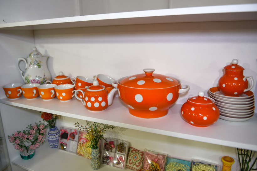 В центре комнаты стоит стол с самоваром. Чай гости пьют из модных в 60-е чашек из красного фарфора в белый горошек. Особенно такие чаепития любят гости из Китая.