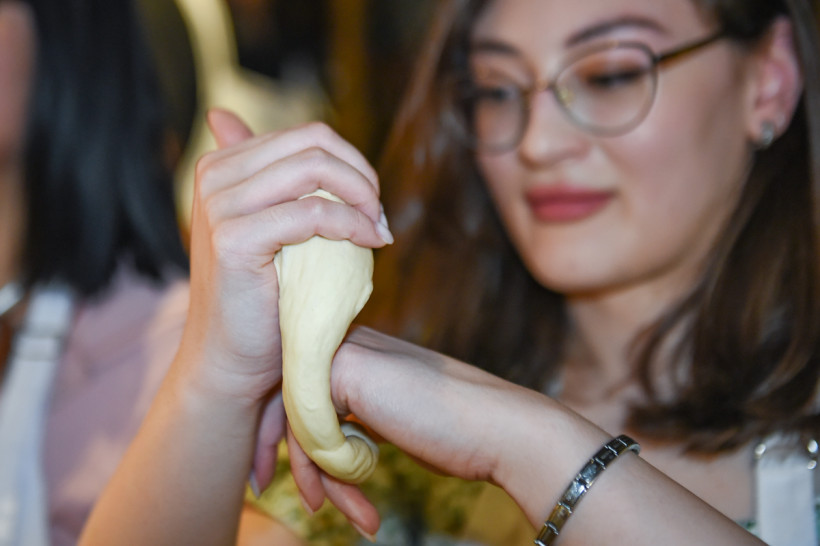 Людмила отмечает, что калач — исконно русское лакомство. «Это было самое дорогое и известное, самое лучшее хлебное изделие. На калачи шла самая дорогая мука. Остальной хлеб делали из более дешевой», — объясняет она. И уже через несколько минут студенты сами пробуют сделать свой первый калач.
