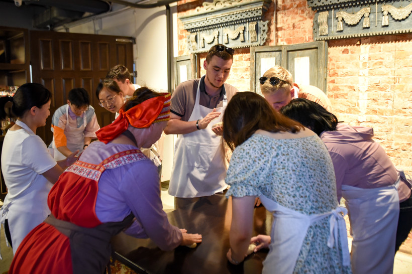 За соседним столиком несколько парней подшучивают над своим товарищем. «Они говорят — ты плохо делаешь, сразу видно, что дома не помогаешь готовить», — переводит Нина. Чжинь Гое со смехом заявляет, что это неправда и он работает с мамой на кухне. Ребята действительно стараются. Настолько, что у одного из них вместо колбаски получается длинная веревочка. И китайские, и русские студенты внимательно следят за экскурсоводом и повторяют все ее движения — молодежи действительно интересно.