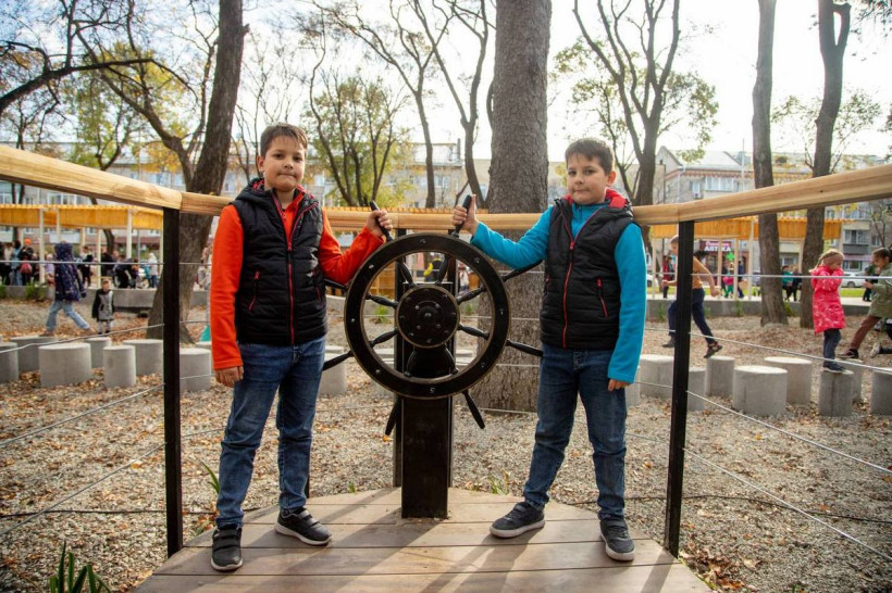 Теперь дети и взрослые, гуляющие в сквере, с удовольствием играют и фотографируются у стилизованного капитанского мостика и книгообменника в виде маяка, и отдыхают на качелях под навесами.