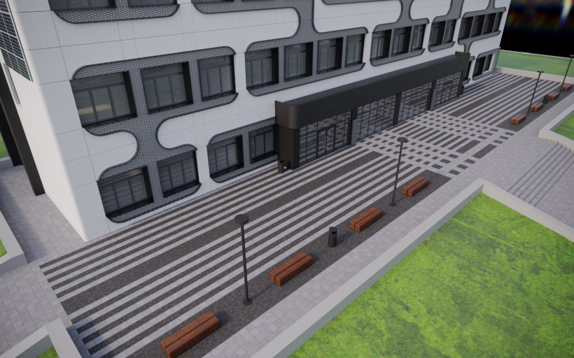 — Мы сделали большую и современную входную группу. Сейчас специалисты занимаются заливкой бетона лестниц, дальше — благоустройство территории. Ее проект также разработали совместно с ЦРТ, чтобы это пространство гармонировало с фасадными решениями и общей стилистикой здания, — подчеркнул подрядчик.