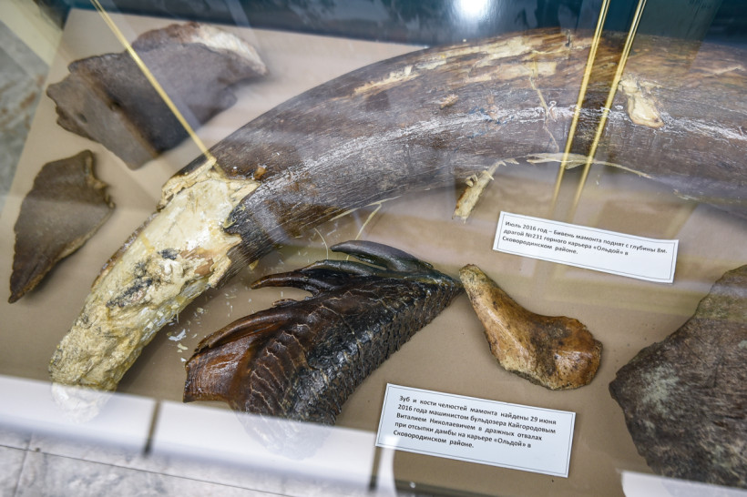В музее можно увидеть рог шерстистого носорога, «добытые» драгой бивни мамонта, деревянные лотки. Фото: Алексей Сухушин