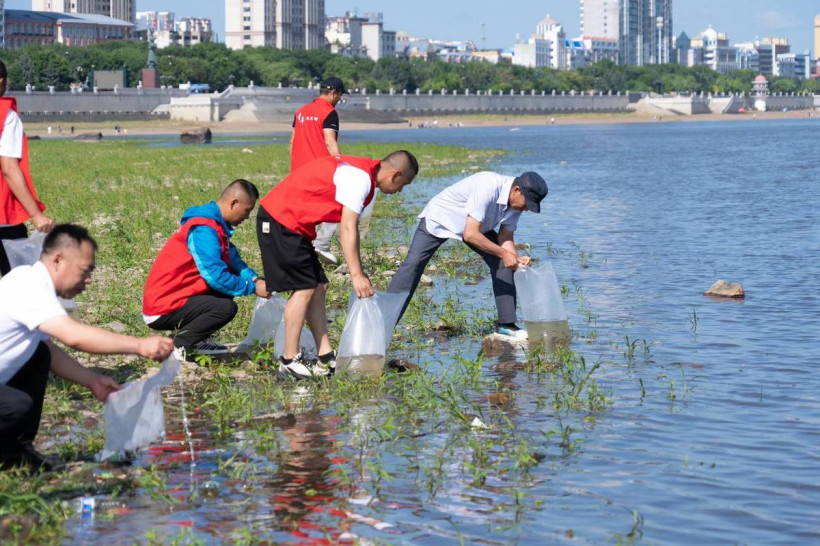 В публикации говорится о том, что такую работу 22 июля провели сотрудники рыбного хозяйства Айхуэй (Хэйхэ). Несколько людей торжественно выпустили в реку юных толстолобиков, окуней, белых амуров и амурских осетров.