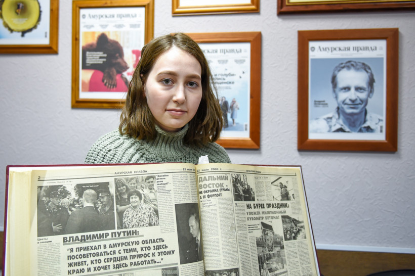 Спустя 10 минут мы с Лизой уже листали подшивку номеров «Амурки» за июль 2000 года. Сегодня, спустя почти четверть века, многие уже не помнят, что тогда в Благовещенск впервые прилетел новый президент России Владимир Путин. Но «Амурскую правду» не зря называют живым учебником по истории области: в нескольких выпусках газеты — все подробности о встречах, передвижении, заявлениях, меню и даже подарках главе государства.