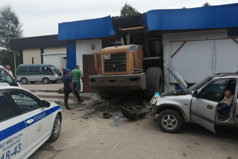 В субботу, 3 августа, в Тынде большегрузная спецтехника протаранила здание магазина. В киоск, где торгуют продуктами, погрузчик въехал на скорости, зацепив по пути припаркованный автомобиль.