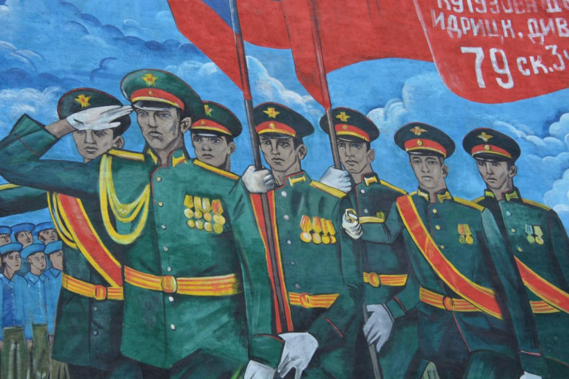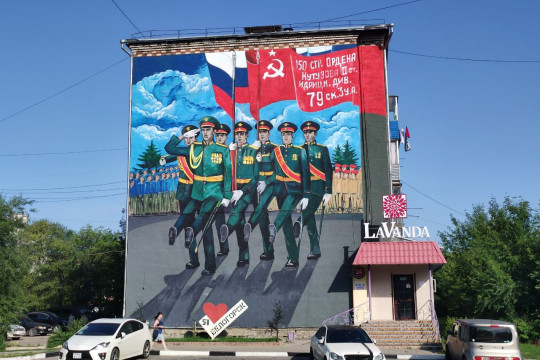 С первым муралом художник из Владивостока Павел Малицкий работу уже закончил. Картина со знаменной группой 35-й Армии на параде Победы украсила торцевую стену пятиэтажки по улице Авиационной, 10.