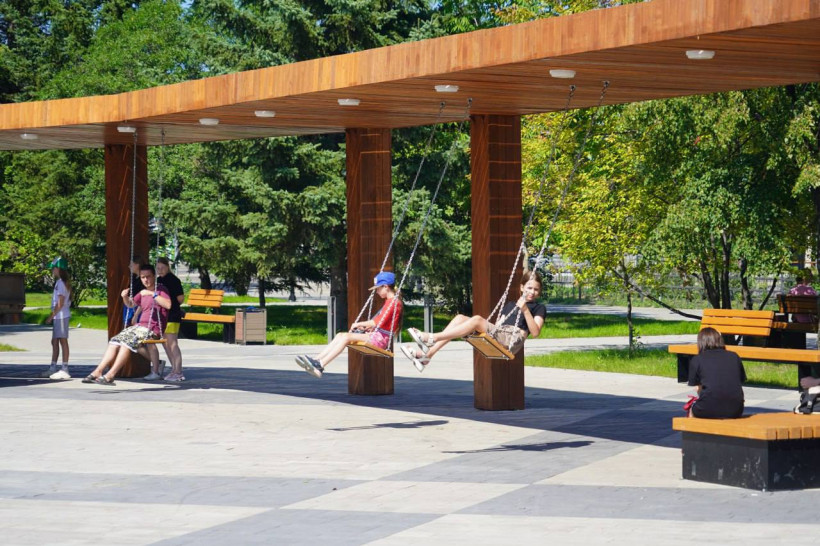 Центральная площадь стала современным пространством с функциональными зонами и местами отдыха, которые будут доступны круглый год. Горожан встречают сухой фонтан с подсветкой, прогулочные аллеи, уличный кинотеатр, современная и красивая сцена. Юные свободненцы облюбовали одно из мест, где можно покачаться с ветерком — перголу с качелями. Она тоже стала украшением площади.