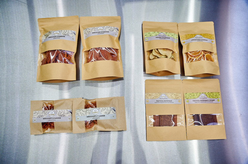 Предприятие на сегодня занимает уже 94 «квадрата», здесь два цеха — по производству консервированных продуктов и по производству сушеной продукции. Разнообразные каши с курицей, говядиной, свининой, тушенка, горбуша, а также сушеные продукты — мясо и фрукты, несколько видов пастилы — ассортимент предприятия достигает порядка 50 наименований.