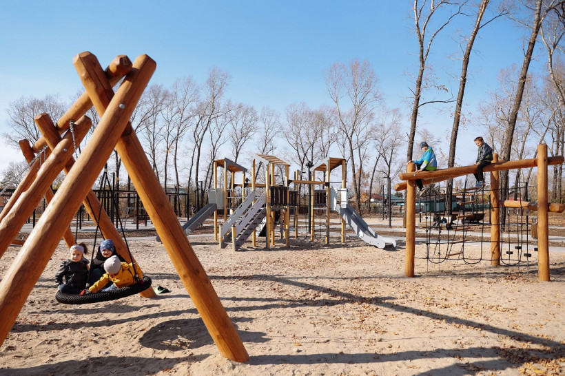 В новом сквере на площади 5 тысяч квадратных метров установили детские горки, качели, скамейки, проложили дорожки, установили освещение. Рабочим осталось только смонтировать подвесные качели под навесами. Все работы должны быть завершены до середины октября.