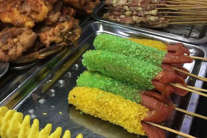 Первое, что сначала нас привлекло, а потом, наоборот, отпугнуло — специфические запахи. Передвижные лотки расположились напротив друг друга, и в каждом из них что-то жарили на решетках или в воках в большом количестве масла. Через 30 минут нахождения на ночном рынке мы пропахли не очень приятными запахами. Казалось, ими уже и наелись.