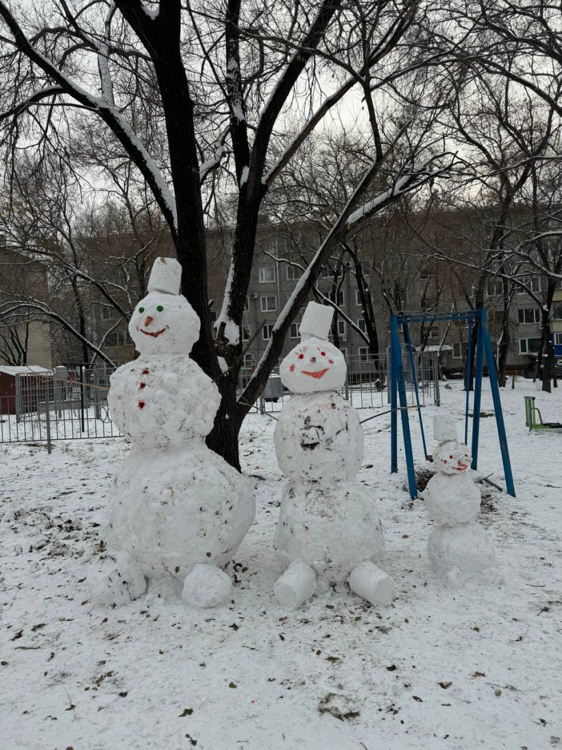 Первый серьезный снегопад 3 ноября в амурской столице добавил работы коммунальщикам. Но доставил радость юным благовещенцам. Вместе с друзьями, родителями и целыми компаниями с удовольствием они лепили снежных баб разных размеров, украшенных декоративными деталями и просто осенними листьями. Семьи снеговиков и одиночки заселили улицы и дворы Благовещенска. Их можно встретить и на площадях, в скверах, у входов в магазины и вдоль проезжей части. «Амурская правда» делится фотографиями снежных скульптур, присланными в редакцию.