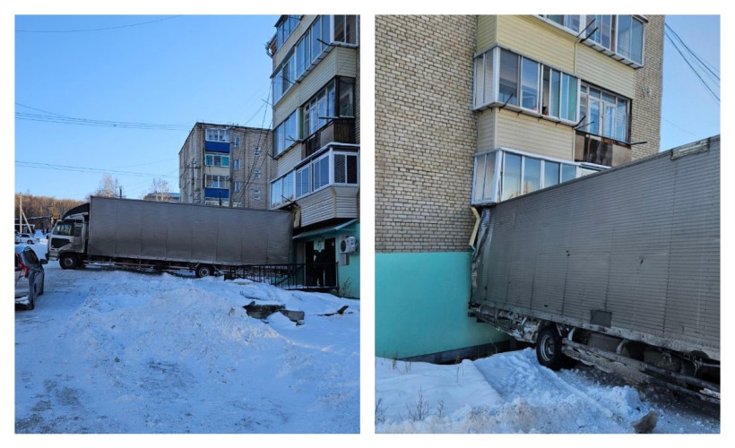 Выясняются обстоятельства ДТП в Сковородине: большегруз врезался в стену жилого дома, задев балкон на втором этаже.